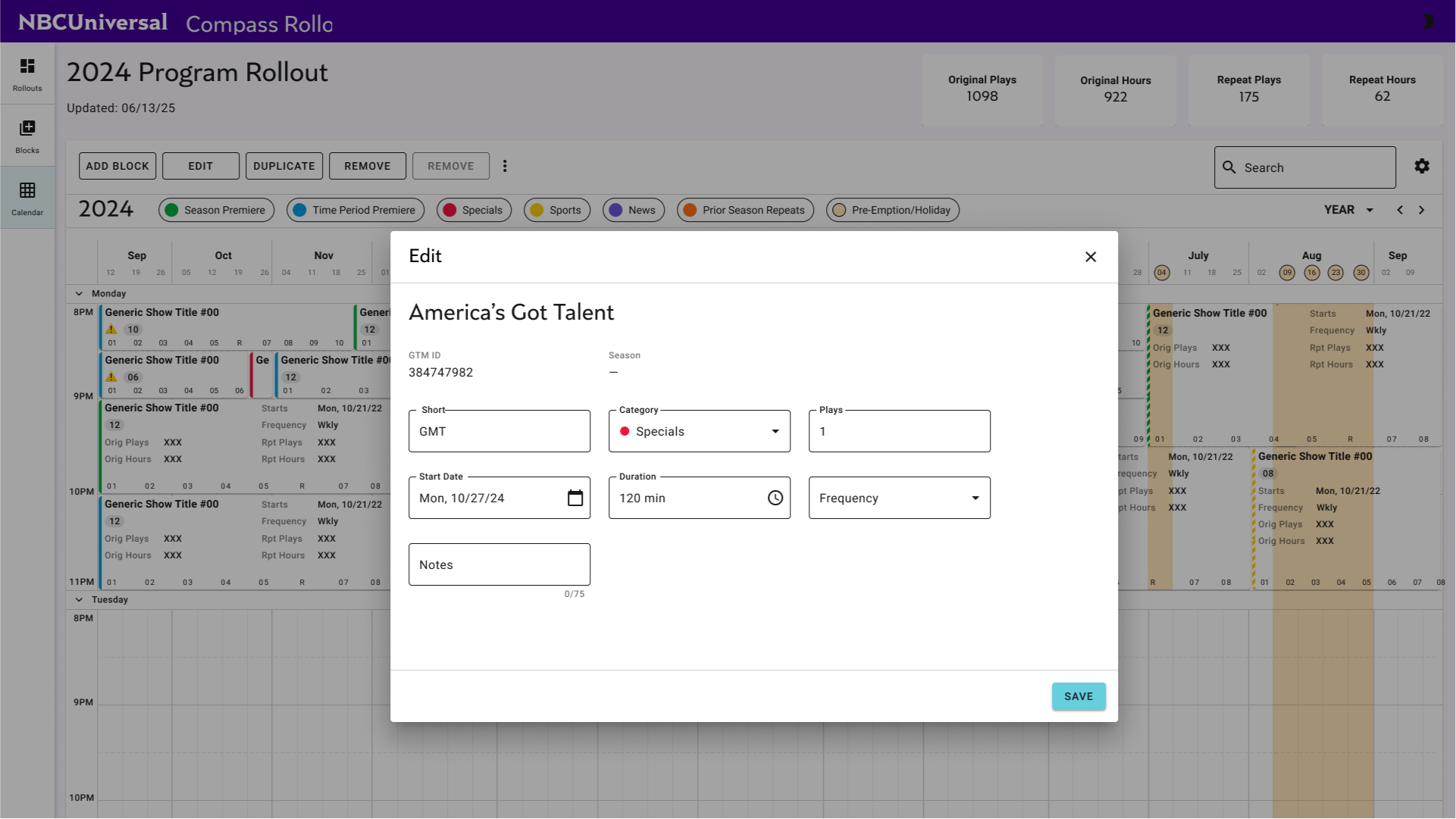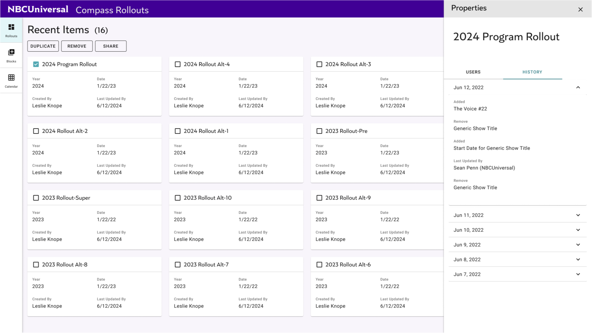 The scheduling teams wanted a single place where they could create/edit/manage rollouts and publish them to Finance so they could assess budget impacts of schedule changes.