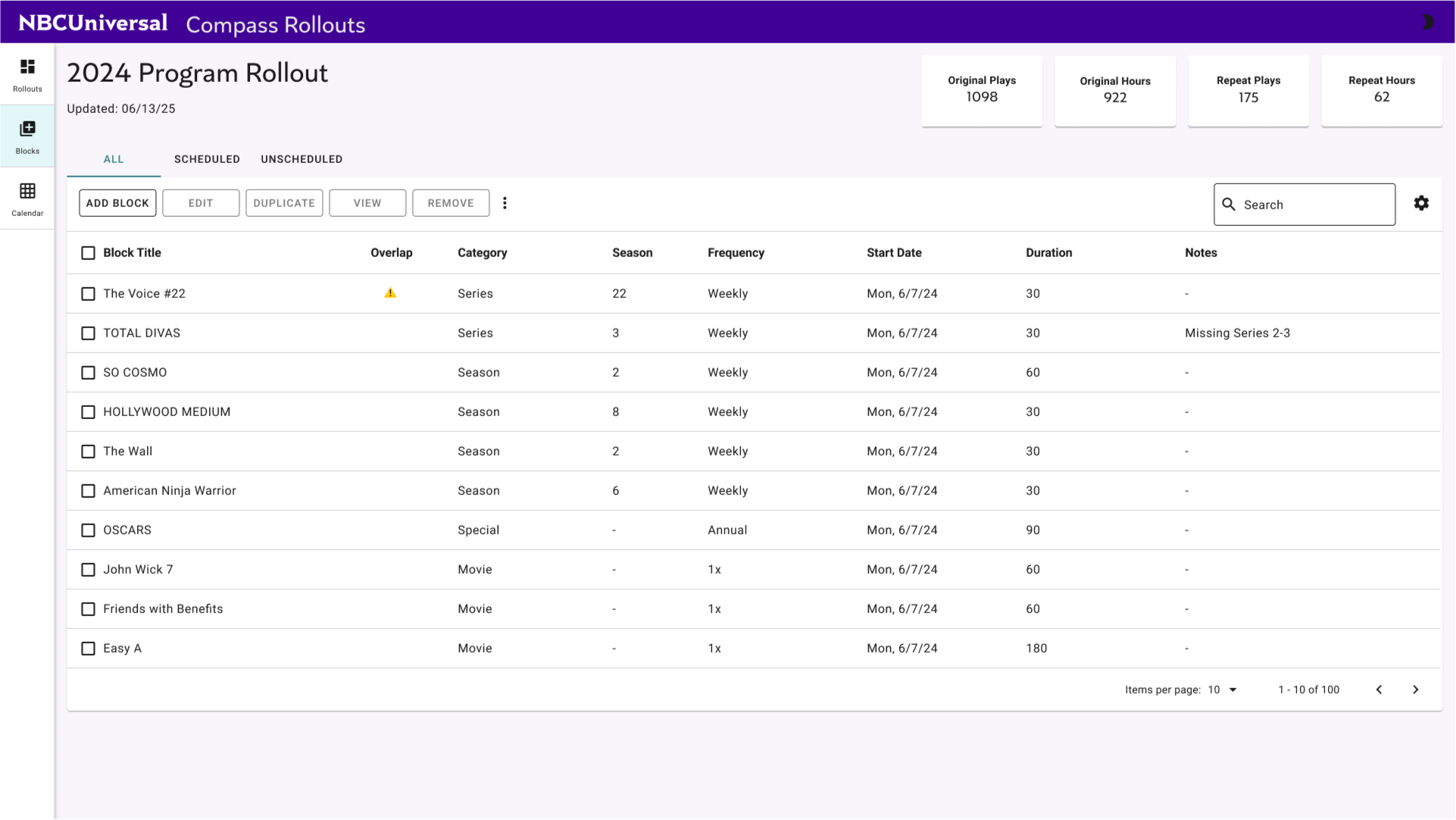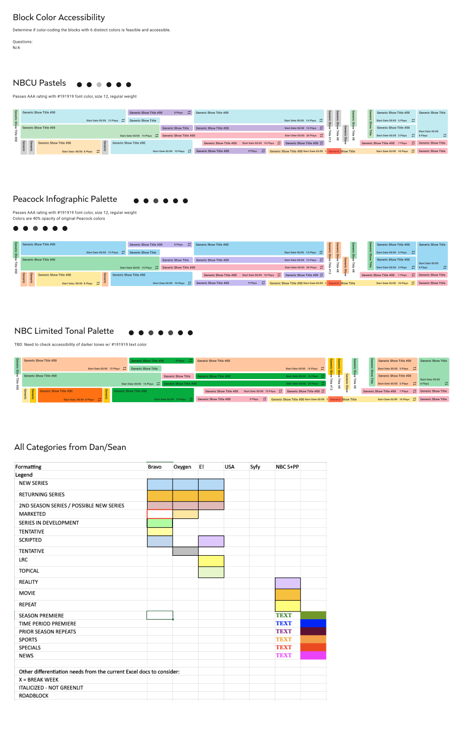 We studied scheduling apps and in-house planning solutions to see the best way to display a grid of TV shows. No solution provided a simple way to view 12 months worth of content with metadata available at a glance.
