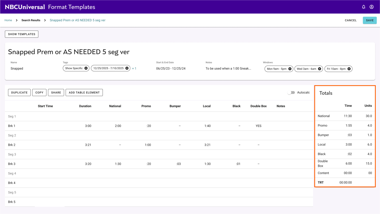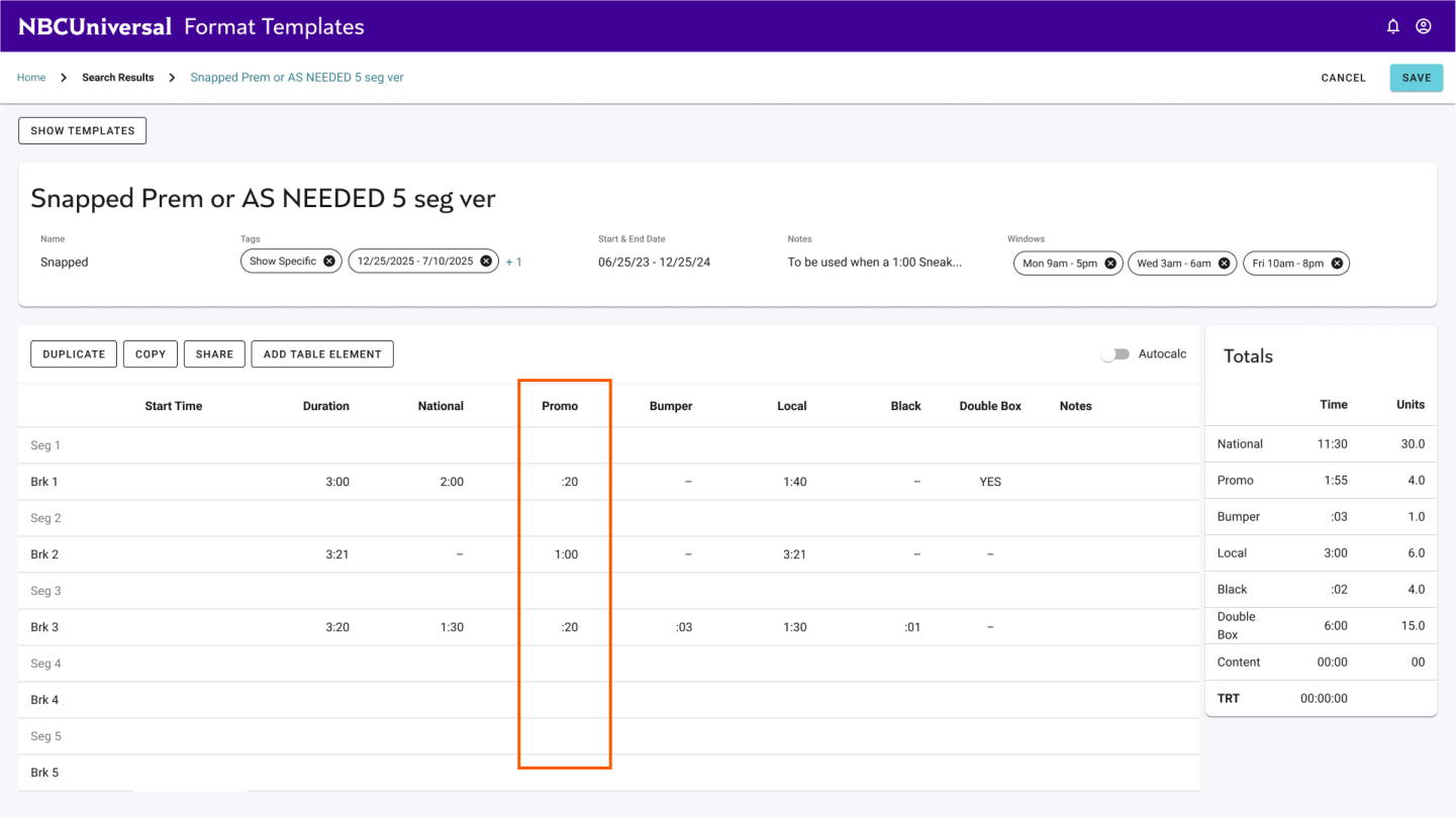 One large efficiency gain that I designed into the templates was the ability to view all events vertically at a glance and see how many of each category were on the schedule. This was possible because all event types are now displayed from left to right in order of broadcast time.