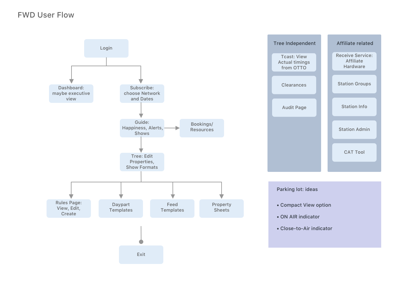 Pivot: Due to a shift in business goals, this project was placed on an incremental path. I developed templates for CRUD pages, a dashboard, a show selection workflow, a new form page, and an overlay solution for event management.