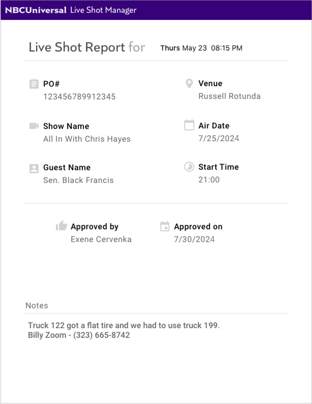 We made much of the metadata auto-fill the form when initial information is input. We designed an automated email as a sort of receipt when live shots are ordered and control rooms are confirmed.